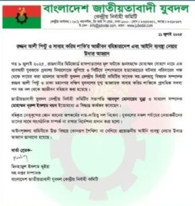 জাতীয়তাবাদী যুবদল কেন্দ্রীয় নির্বাহী কমিটির সভাপতি আবদুল মোনায়েম মুন্না ও সাধারণ সম্পাদক মোহাম্মদ নূরুল ইসলাম নয়ন ইতোমধ্যে এ সিদ্ধান্ত কার্যকর করেছেন।
