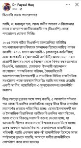 আমি, ড. ফয়জুল হক, আজ গভীর আবেগ ও বিবেচনার সাথে বাংলাদেশ জাতীয়তাবাদী দল (বিএনপি) থেকে পদত্যাগের ঘোষণা দিচ্ছি।