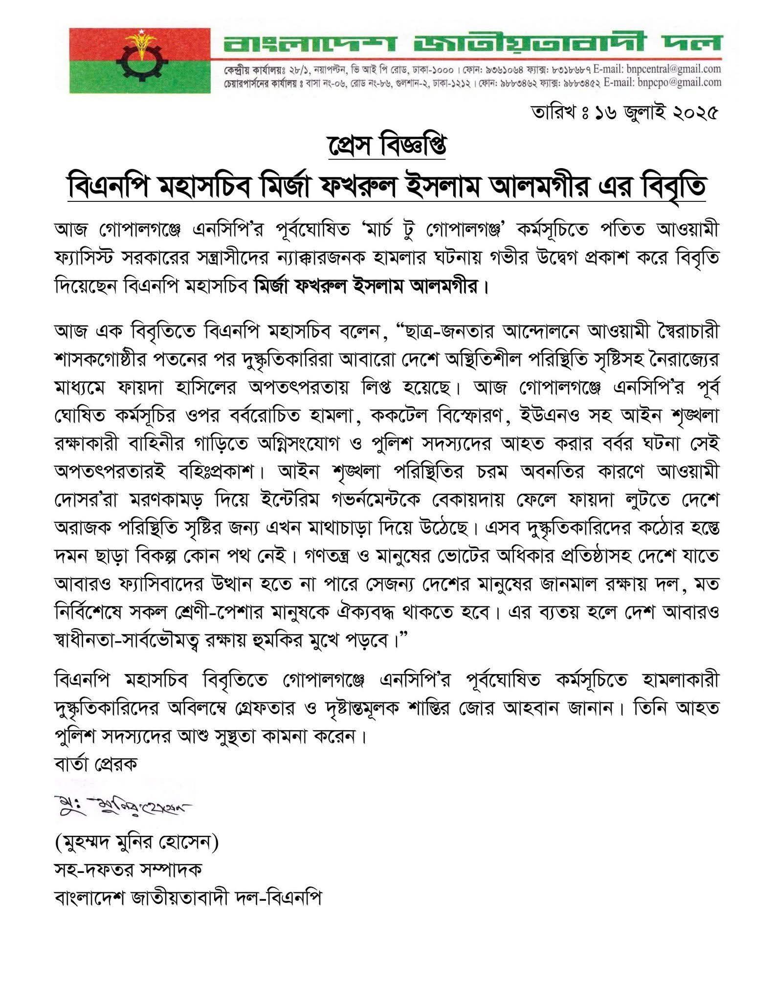 গোপালগঞ্জের ঘটনায় বিএনপি মহাসচিব মির্জা ফখরুল ইসলাম আলমগীর এর বিবৃতি