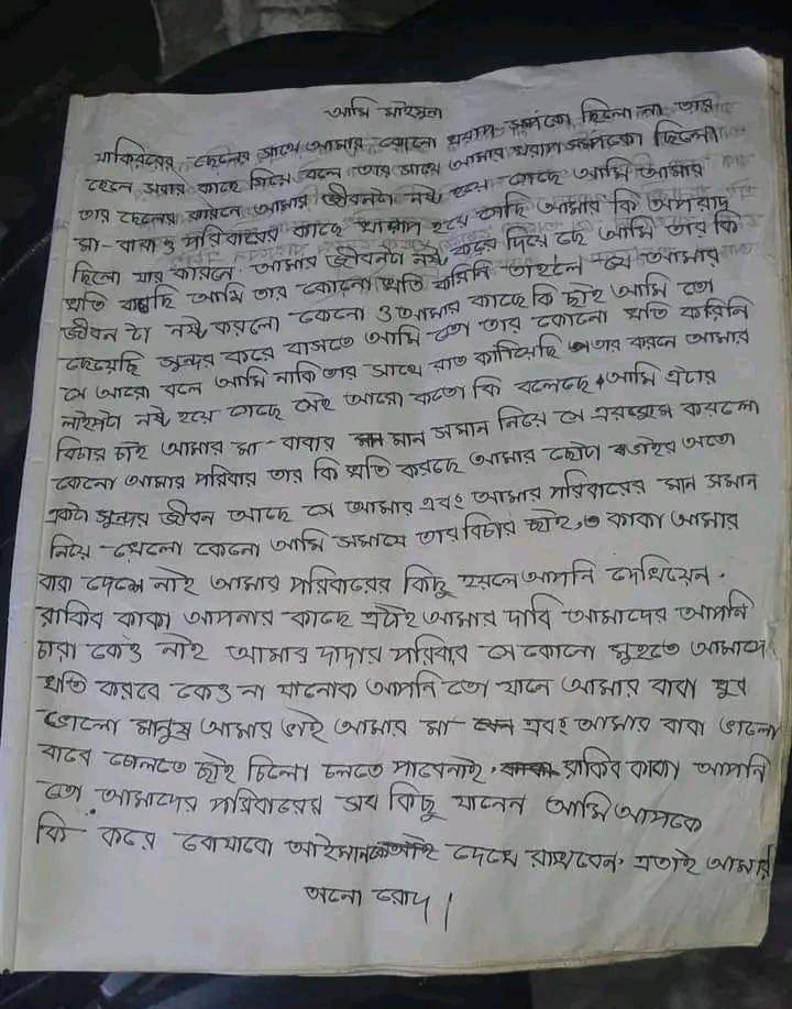 কমলনগর (লক্ষ্মীপুর) : চিরকুটে অপরাধীর বিচার চেয়ে লক্ষ্মীপুরের কমলনগরের উপজেলায় মাইমুনা আক্তার (১৫) নামে এক মাদ্রাসা ছাত্রী গলায় ফাঁস দিয়ে